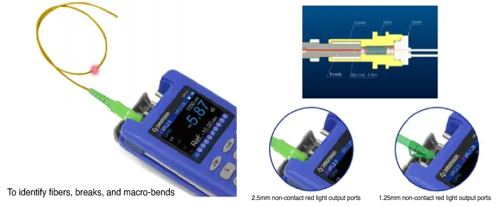 The optical probe is equipped with 2.5mm and 1.25mm non-contact red light output ports. The non-contact design will not damage the end face due to plugging and unplugging, and the design of 2.5mm and 1.25mm red light output ports is suitable for most application scenarios. The device has two modes of emitting optical signals (continuous, flashing) to identify fibers, breaks, and macro-bends.